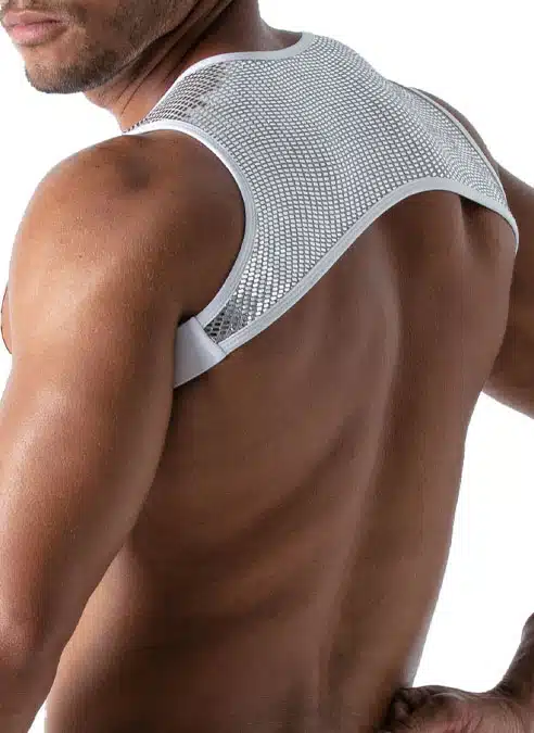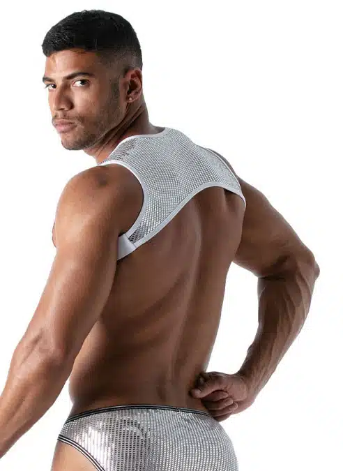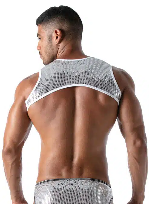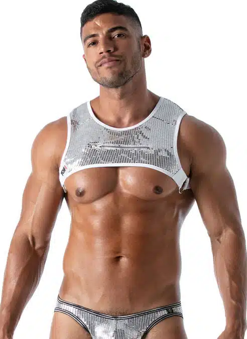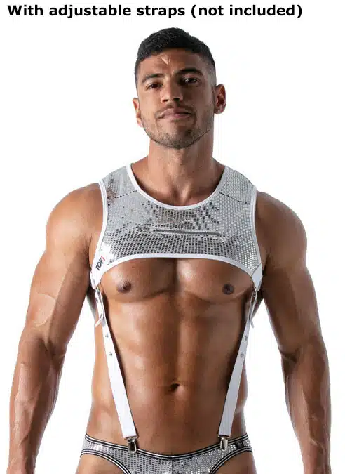Get the outfit complete with this shiny chest harness. It has a zipped pouch on front for all your important items and has two rings on the side on which you can attach the separately available suspender straps to make it a body harness.